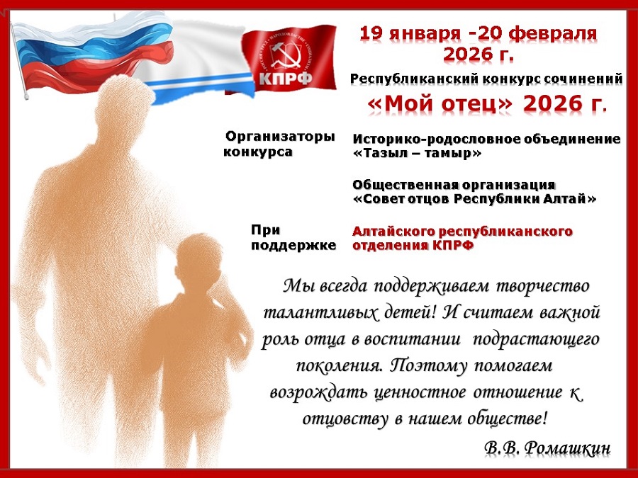 С 19 января по 20 февраля в Республике Алтай состоится республиканский конкурс сочинений "Мой отец! 2026г.
