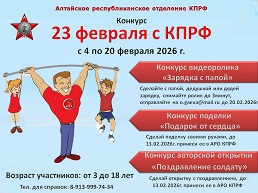 Приглашаем принять участие в республиканском конкурсе '23 февраля с КПРФ". Организаторами конкурса выступают Алтайское республиканское отделение КПРФ и Майминское местное отделение КПРФ. Целью конкурсаявляется пропаганда семейных традиций и нравственных гражданских ценностей, возрождение ценностного отношения к отцовству в обществе, передача позитивного опыта от поколения старших к младшему поколению. Срок проведения конкурса: с 4 февраля по 20 февраля 2026 года. Возраст участников: от 3 лет до 18 лет ( допускаются к участию обучающихся общеобразовательных организаций в возрасте 18 лет). Конкурс проводится в трех номинациях: * Конкурс видеоролика «Зарядка с папой». Участник делает зарядку с отцом (дедушкой, дядей), процесс зарядки в видеоролике направляет Организатору до 20 февраля 2026 г.