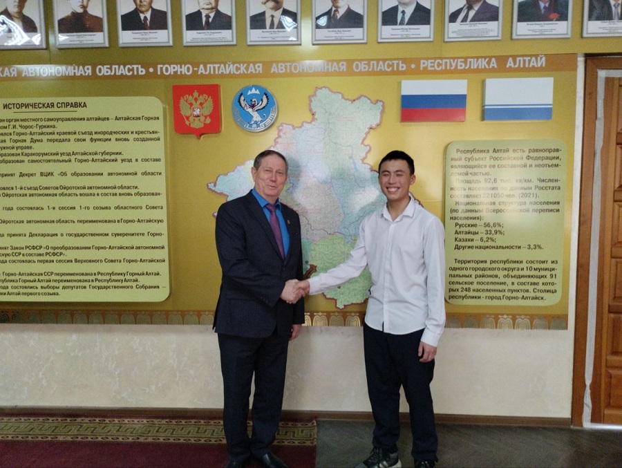 18 февраля Первый секретарь Комитета АРО КПРФ, депутат Республики Алтай Виктор Васильевич Ромашкин встретился с обучающимся Майминской СОШ № 1 им. Н.А. Заборского Рахметчановым Саятом и его руководителем учителем истории Киндиновым Михаилом Александровичем. Юный исследователь задал вопросы о первом председателе Ойротского облисполкома Никите Федоровиче Меджит-Иванове. Виктор Васильевич рассказал, что Никита Федорович стоял у истоков выделению Ойротской автономной области из Горно-Алтайского уезда. В результате работы первого председателя Облисполкома Ойротской области, беднейшее население было освобождено от уплаты единого натурального налога (такой налог платили хозяйства, у которых было свыше пяти голов крупного рогатого скота).