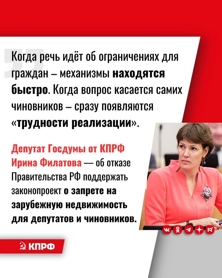Правительственная комиссия по законопроектной деятельности в своем отзыве признала направленность инициативы «заслуживающей внимания», но подчеркнула, что «реализация процедур проверки соблюдения проектируемого законопроектом запрета в текущих международных условиях может быть затруднительной в зависимости от законодательства соответствующего иностранного государства». Инициативу коммунистов в итоге сочли нуждающейся «в существенной доработке». Депутат Госдумы от КПРФ Ирина Филатова, комментируя это решение, отметила, что коммунисты говорили о логичном продолжении уже действующих ограничений – если запрещены счета за рубежом, то почему допускается владение имуществом? "Мы исходили из простой позиции: в условиях санкционного давления наличие зарубежных активов у лиц, принимающих государственные решения, создаёт риски и потенциальные рычаги влияния. Правительство формально согласилось, что сама идея «заслуживает внимания». Но в итоге отказ – под предлогом сложности контроля". ... Читать дальше »
